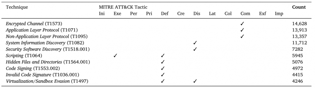 - Defense Evasion (76.65% of samples): This is the most common tactic. Malware authors prioritize concealment using techniques such as